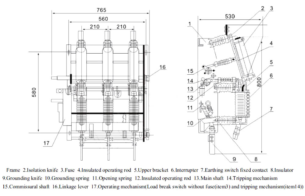 FZN21-12-serie hoogspanningsvacuümbelastingsschakelaar bestaat voornamelijk uit framer, loskoppelingsschakelaar (stroombeperkende zekering van de combiner bevindt zich in de scheidingsschakelaar), vacuümschakelbuis, aardingsschakelaar, veerwerkingsmechanisme enzovoort. Dit product heeft compacte structuur, klein volume, lange levensduur, sterke sluitings- en breekcapaciteit en eenvoudig werking en onderhoud. De vacuümschakelaar is uitgerust met een door de lente beheerd mechanisme, dat een elektromotor (een andere handmatige) voorjaarsenergie-opslag aanneemt, en er zijn twee soorten sluitingsmethoden: Electromagnet Sluiten en handmatige splijten en sluiten. De loskoppelingsschakelaar, vacuümschakelaar en aardingsschakelaar zijn met elkaar verbonden (mechanische in elkaar grijpen) om miswerking te voorkomen.