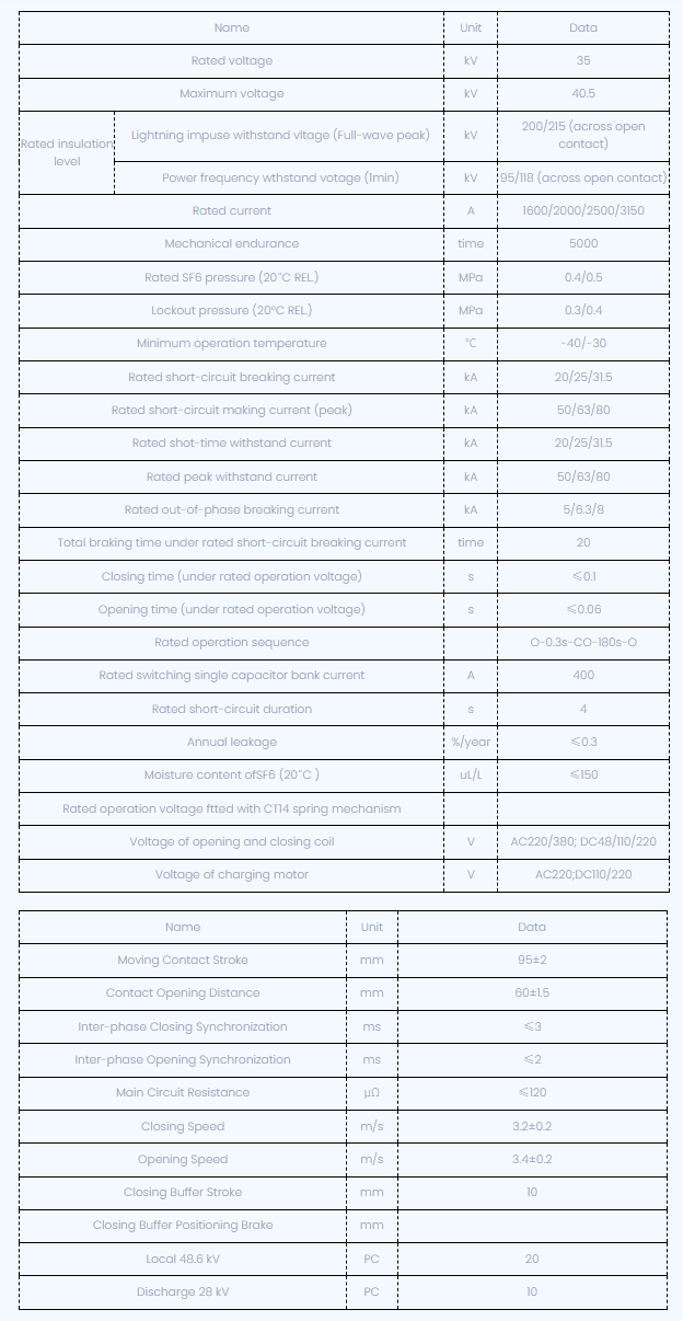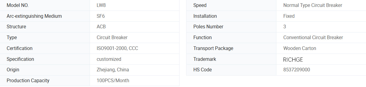LW8-40.5, LW8A-40.5-serie zwavelholse hexafluoride-stroomonderbrekers zijn driefasige AC 50Hz buitenspanning hoogspannings elektrische apparatuur, geschikt voor de regeling en bescherming van 40,5 kV transmissie- en distributiesysteem, kunnen ook worden gebruikt voor verbindingscircuitbreakers en open en dichte capacititoren. Het product kan worden gebruikt met het CT14 -veermechanisme. De stroomonderbreker voldoet aan de National Standard GB1984-1989 AC Hoogspanningsbreker en de International Electrotechnical Commission Standard IEC56, IEC6220-100 Hoogspanningscircuitbreker.